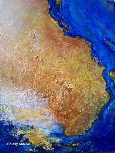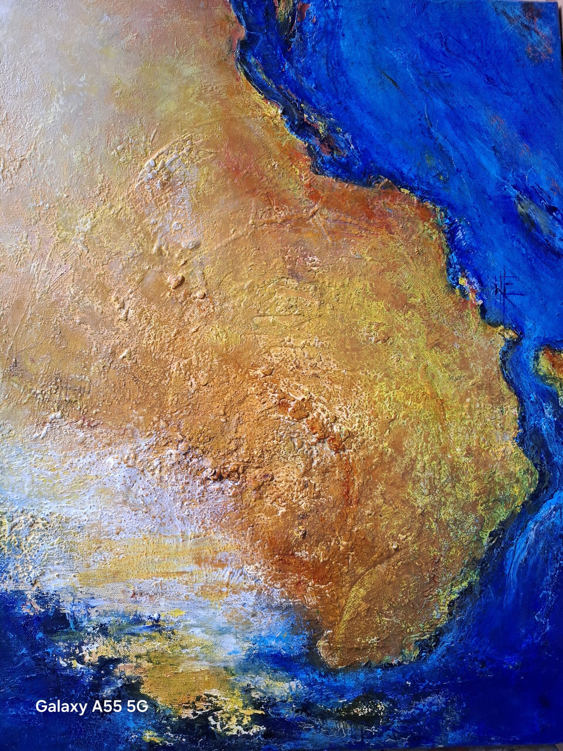 "Je pratique une peinture essentiellement abstraite,intemporelle et intimiste,où l'infiniment petit côtoie l'infiniment grand,un univers architectural attiré par les origines du monde,les frontières naturelles ou humaines,mon lien au minéral,au végétal.