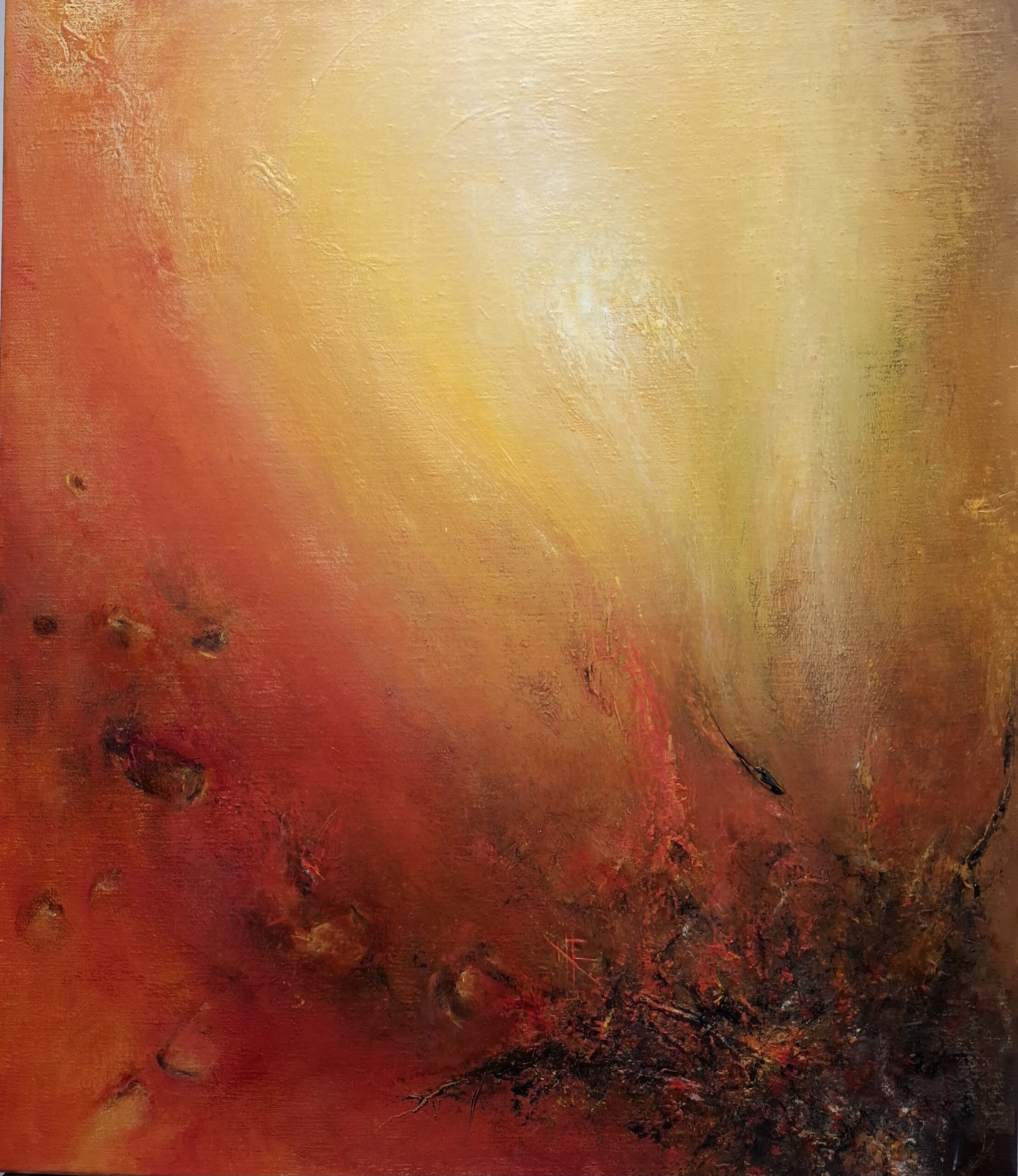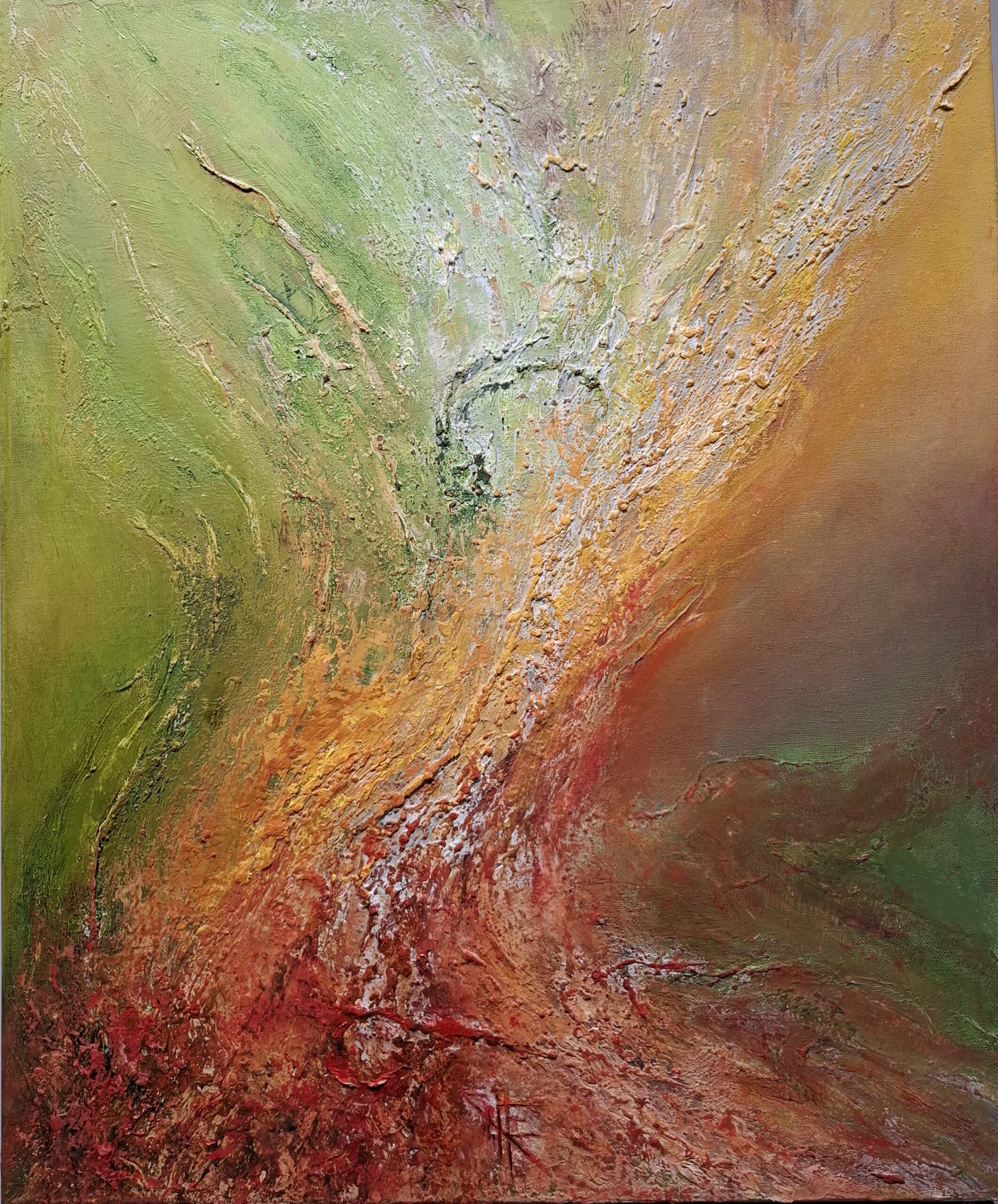 J'aime me sentir dans un contexte de création picturale,sentir l'huile,la regarder,la toucher,je peins principalement au couteau, également avec les mains,en estompant au chiffon.Je travaille par couches successives et ajoute des pigments purs.